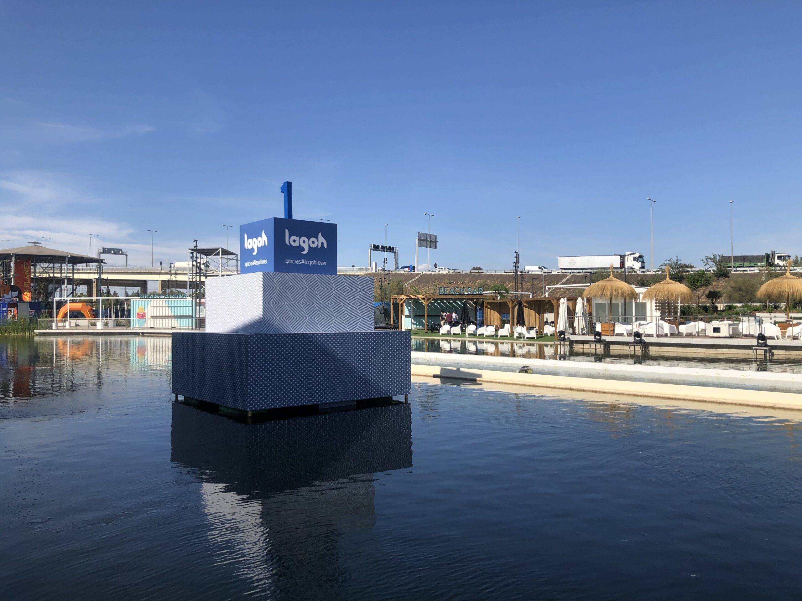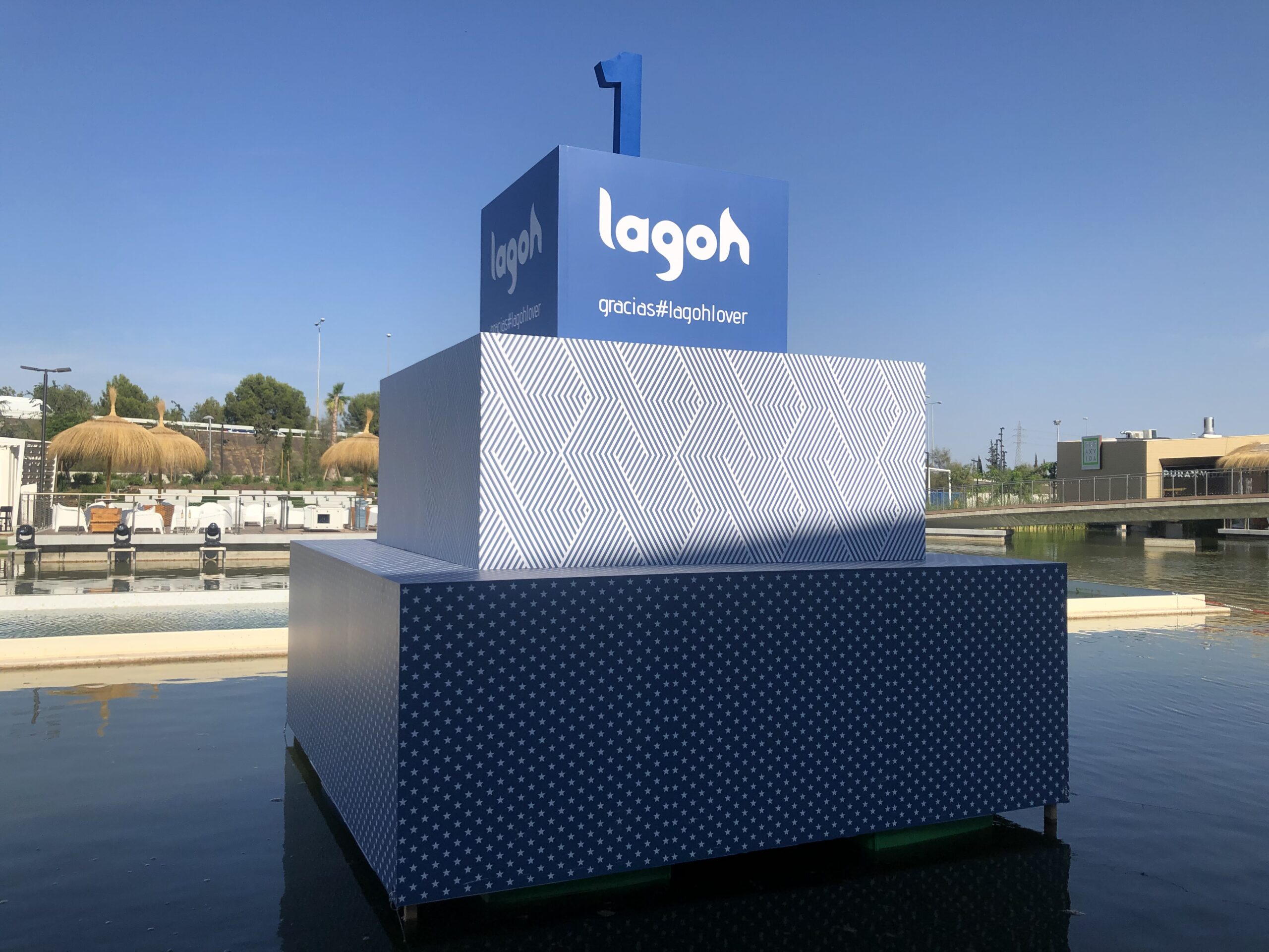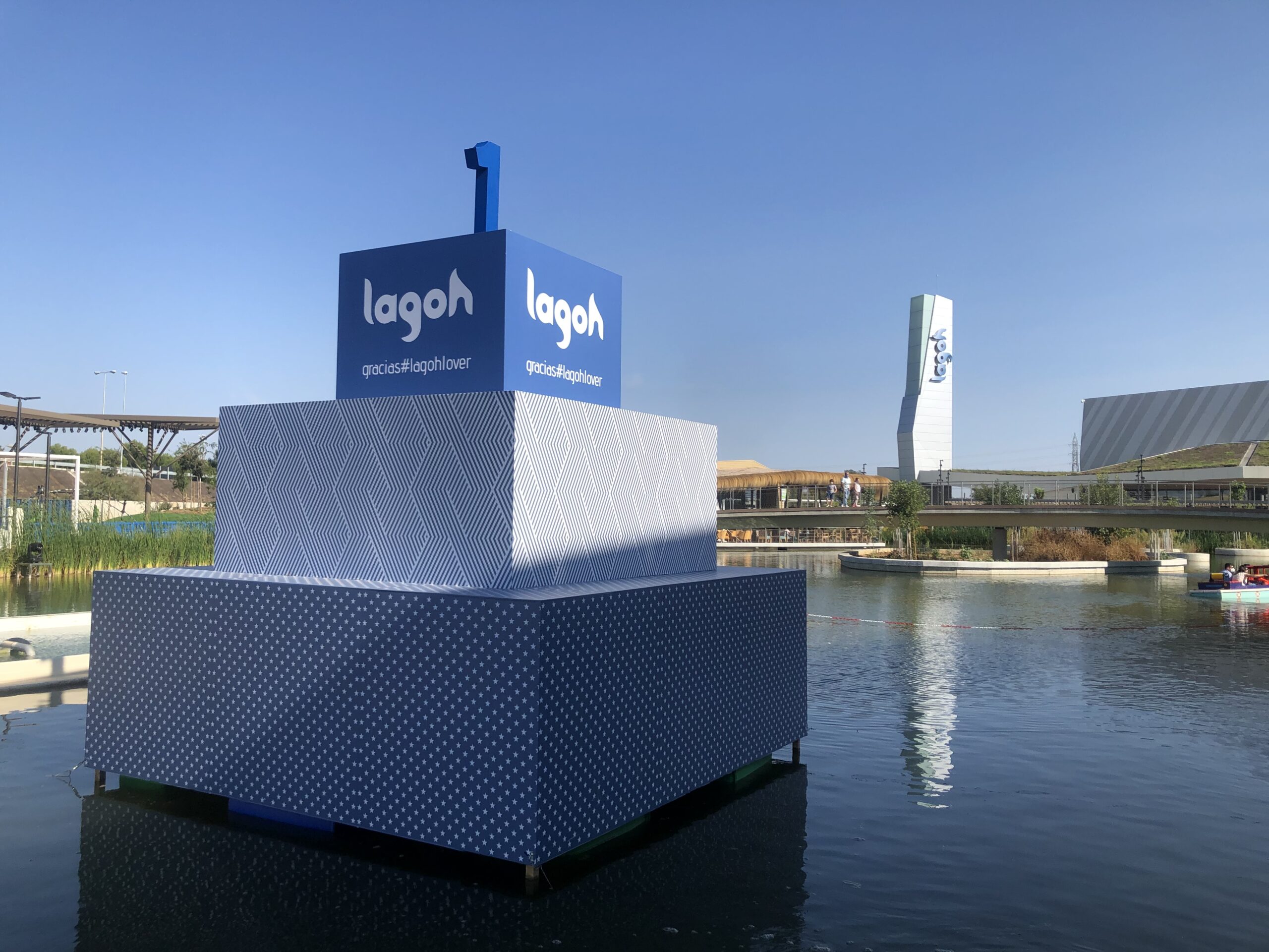 Fabricación de tarta flotante para aniversario del centro comercial.